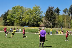 Wieder mussten sich die Mädels kurz schütteln, doch dann begann die Crunch-Time: Das warme Wetter forderte ab Mitte der 2. Hälfte seinen Tribut, aber unser Team zeigte sich topfit – nach Meinung des Konditionstrainers auch aufgrund der Vorbereitung zum Stuttgart-Lauf. Während die Laufwege der Gegnerinnen deutlich kürzer wurden, beackerten unsere Mädels das gesamte Spielfeld und holten sich selbst die Aus-Bälle im Sprint. Dieser Einsatzwille wurde belohnt – das von Cathe gehütete und von der umsichtigen Annika, Ann und Eslem verteidigte Tor kam nicht mehr in Gefahr, im Mittelfeld wirbelten Emily M., Lucy, Emilie B., Lucy und Anyeline um die Gegnerinnen und in der Offensive erzielten Leonie D. und 2x Emily R. die Tore zum 6:3 Endstand.