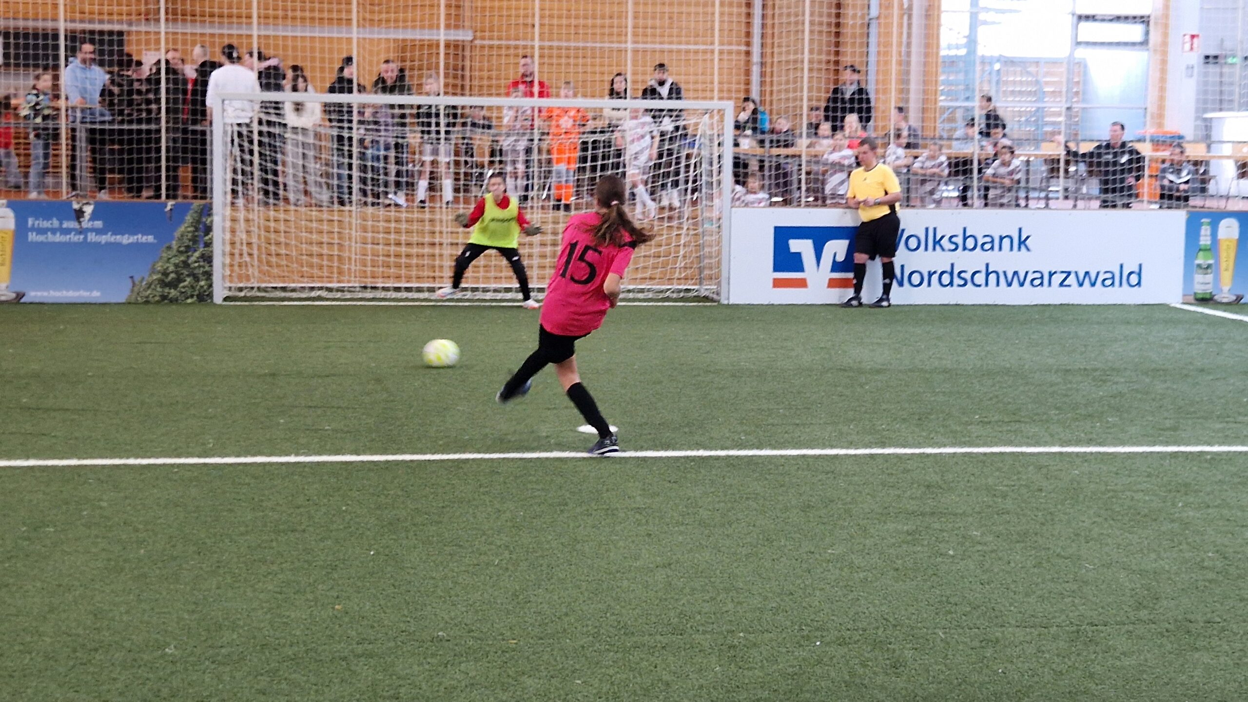 Die D-Mädels steigerten sich nach dem zähen Start von Spiel zu Spiel und hatten im letzten Spiel gegen die SGM Mönchberg/Kayh/Bondorf noch die Chance zum Finaleinzug. Mit einem frühen Führungstreffer war man im Plan, musste dann allerdings den Ausgleich hinnehmen. Nun galt es, offensiv Vollgas zu geben – wobei in den letzten Sekunden der Sprit ausging und die SGM mit dem Schlusspfiff den Siegtreffer erzielte, der nach Diskussion der Turnierleitung mit dem Schiedsrichter gegeben wurde. Nun durften auch die D-Mädels ins kleine Finale, dort stand der Vergleich gegen den Tabellenführer unserer Kreisstaffel, die JSG Gäu, an. Es folgte ein spannendes Spiel zweier gleichwertiger Gegner, das folgerichtig mit 2:2 endete. Also ein weiteres Mal ins Elfmeterschießen, wobei wir dieses Mal das bessere Ende für uns hatten.