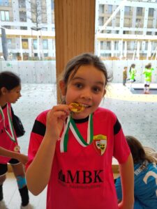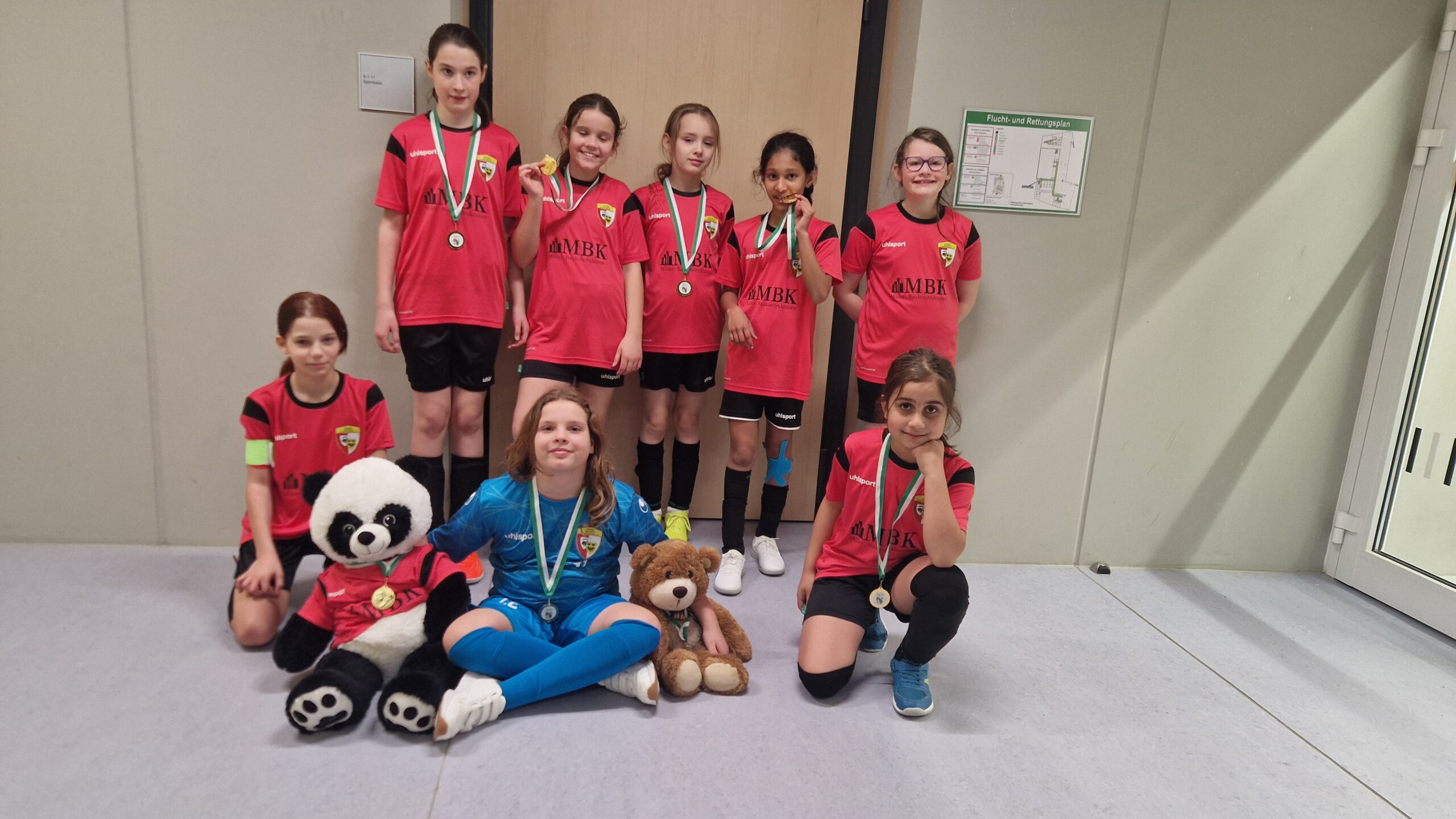Wir dagegen mussten unsere Koffer bzw. Sporttaschen nach der Vorrunde packen, weil auch die weiteren Spiele gegen Stuttgart-West, Deizisau I und Kleinaspach nach diesem Muster verliefen. Hinten wehrten Torhüterin Leonie W. und Abwehrchefin Lisann bis auf zwei Ausnahmen souverän alle Angriffsversuche ab, im Mittelfeld erzeugten Leonie D. und Ann eine Überlegenheit, unsere beiden Debütantinnen Amelie und Tabea fügten sich nahtlos ein und im Sturm erkämpften sich Jana und Emilie “Fiona” zahlreiche Chancen. Aber das gegnerische Tor blieb wie vernagelt – auch, weil die Gegner schnell bemerkt hatten, dass sie unser Mittelfeld-Duo einbremsen mussten und dies teilweise massiv umsetzten. Hier wäre manchmal der Einsatz eines Schiedsrichters wünschenswert gewesen. Die Beiden mussten jedenfalls nach dem Turnier erstmal in der Eisgrotte des Panorama-Bades die blauen Flecken kühlen.