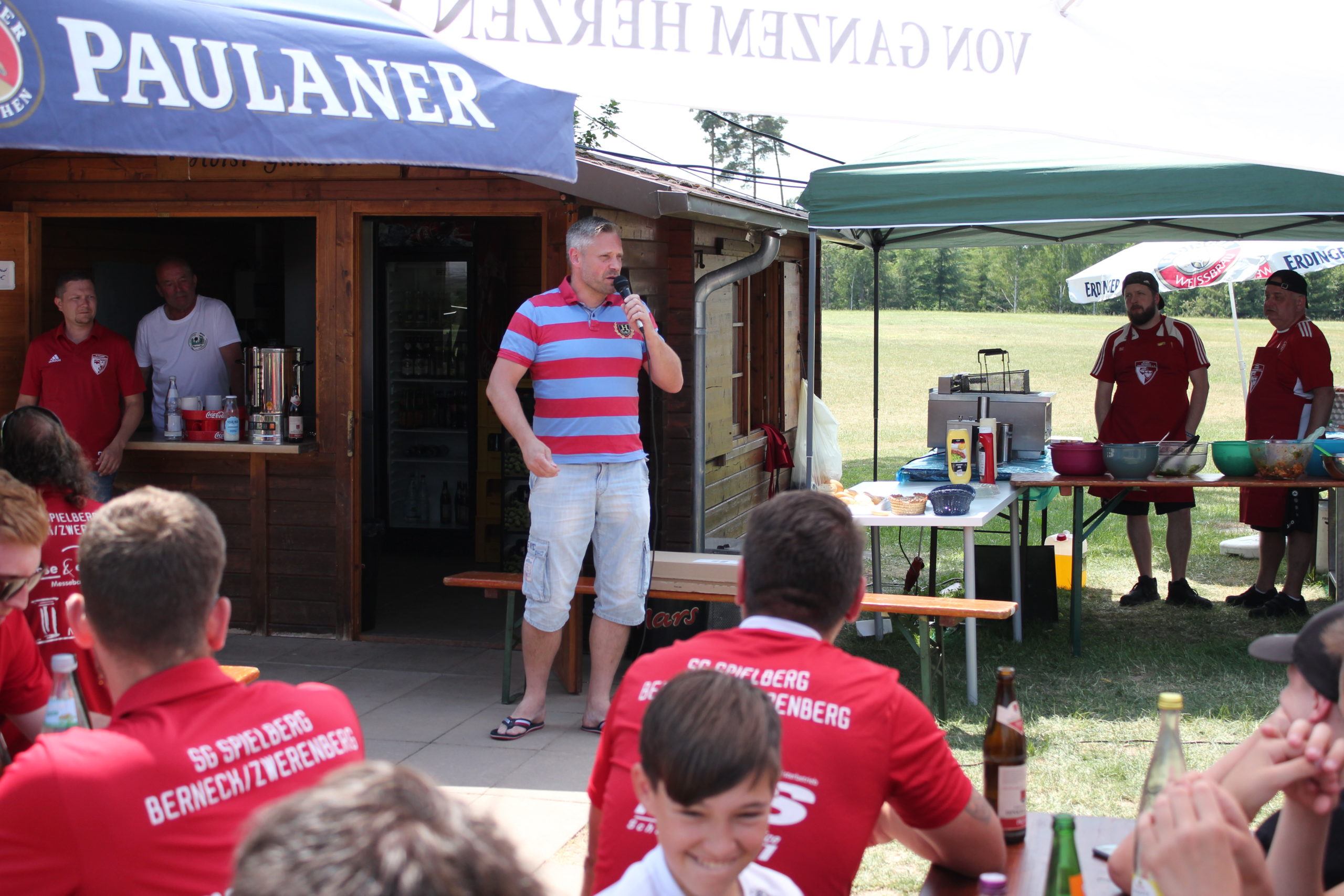 Los gings um 10.30 Uhr mit einem lockeren Kick für alle die Lust hatten das Runde ins Eckige zu befördern. Ab 12.00 Uhr grillten Bernd, Vanessa, Christina und Paddy Wurster für uns leckere Fleischvariationen. Küchenfee Tina Keck hatte alles unter Kontrolle, Gaby Großhans alle Hände voll mit der Ausgabe von leckeren Pommes und Theo war in der Getränkeausgabe sehr gut beschäftigt. Dazu gab es köstliche frische Salate und verführerische Desserts.